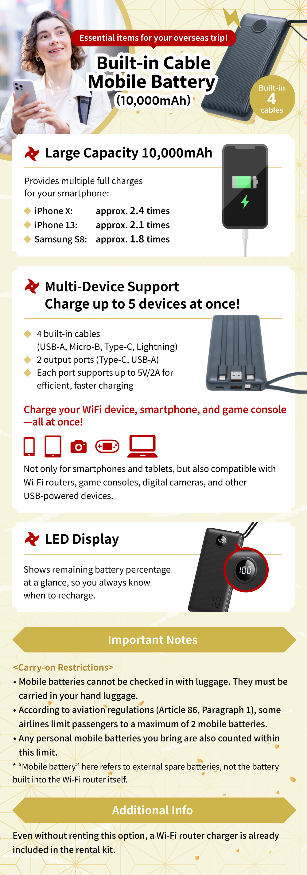 With the built-in cable, you can instantly charge both your phone and the WiFi router with just this one device.