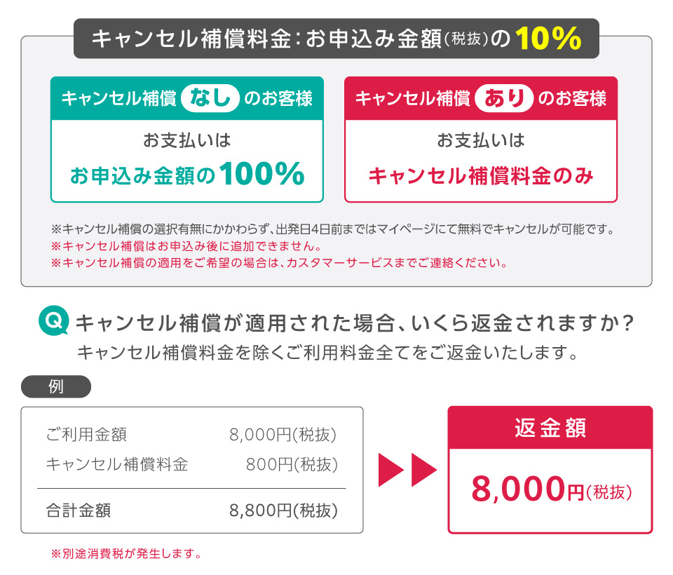 3.3 | 当社Webサイトに掲載されている料金は車1台ごとの料金となり、ご利用人数によって値段が変わることはありません。なお、お客様は、お客様のご利用人数および積載量に鑑み、当社またはサプライヤーの判断で車を追加手配する場合があること、この場合に追加料金が発生する場合があることについて、予め了承するものとします。 |