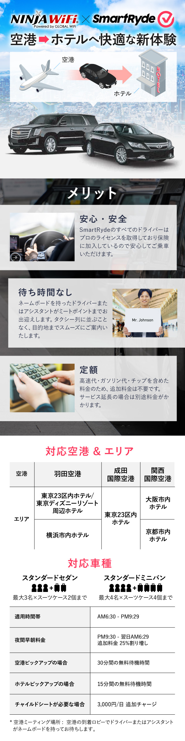 サプライヤーの事情によりご予約をお断りすることがあります。 当社はお客様からのご依頼について、サプライヤーがお客様に送迎サービスを提供することを保証するものではありません。 ご予約をお断りさせていただく際には、予約時にご入力いただいたメールアドレスにお知らせをさせていただきます。 当社の判断により代替となる手段を提案させていただく場合もありますが、その際に発生する追加料金について、当社またはサプライヤーが補償することはできません。 手配が完了するまでサプライヤーの情報はお客様へお知らせすることはできません。 |
