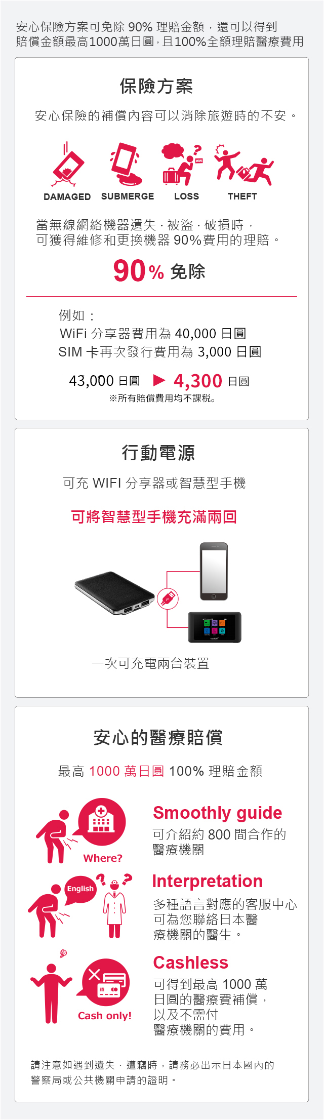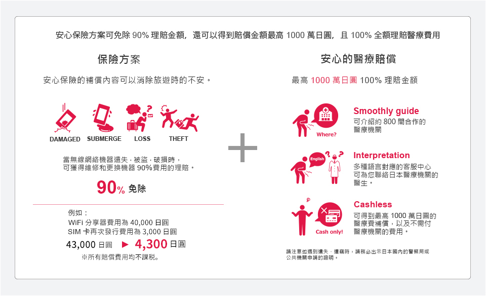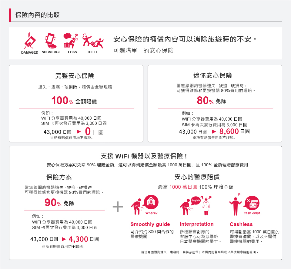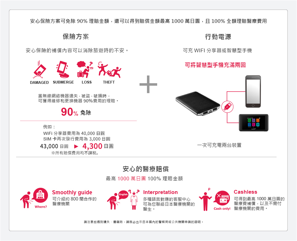 WiFi與醫療保險組合方案可免除90%理賠金額,並可獲得100%全額理賠醫療費用高達1000萬日圓