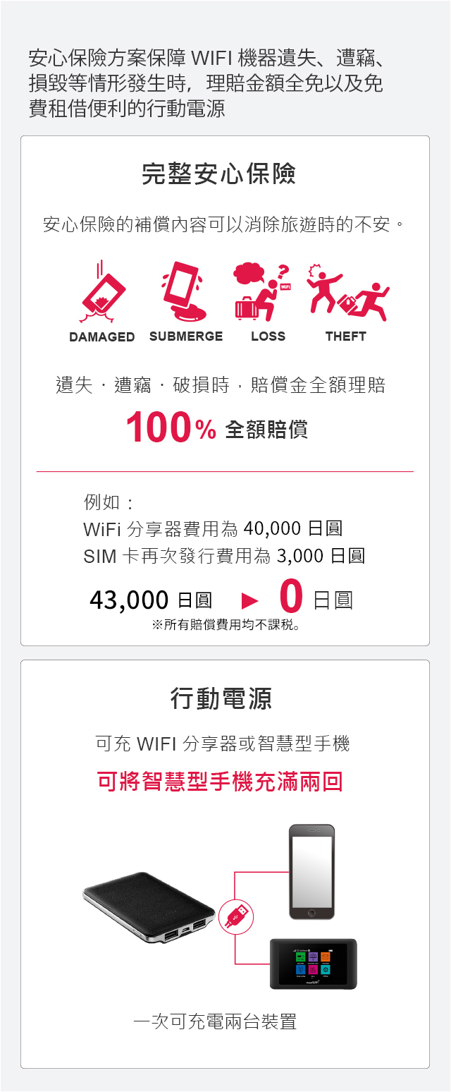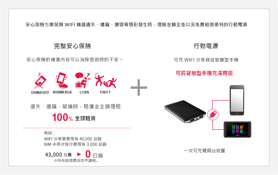 安心保險方案保障WIFI機器遺失,遭竊,損毀等情形發生時,理賠金額全免以及免費租借便利的行動電源